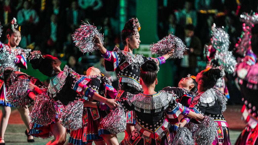 4月13日,演員在啟動儀式上進行歌舞表演。當日,大地流彩·2025年全國和美鄉村籃球大賽(村BA)啟動儀式在貴州省黔東南苗族侗族自治州臺江縣臺盤村舉行。新華社記者 陶亮 攝