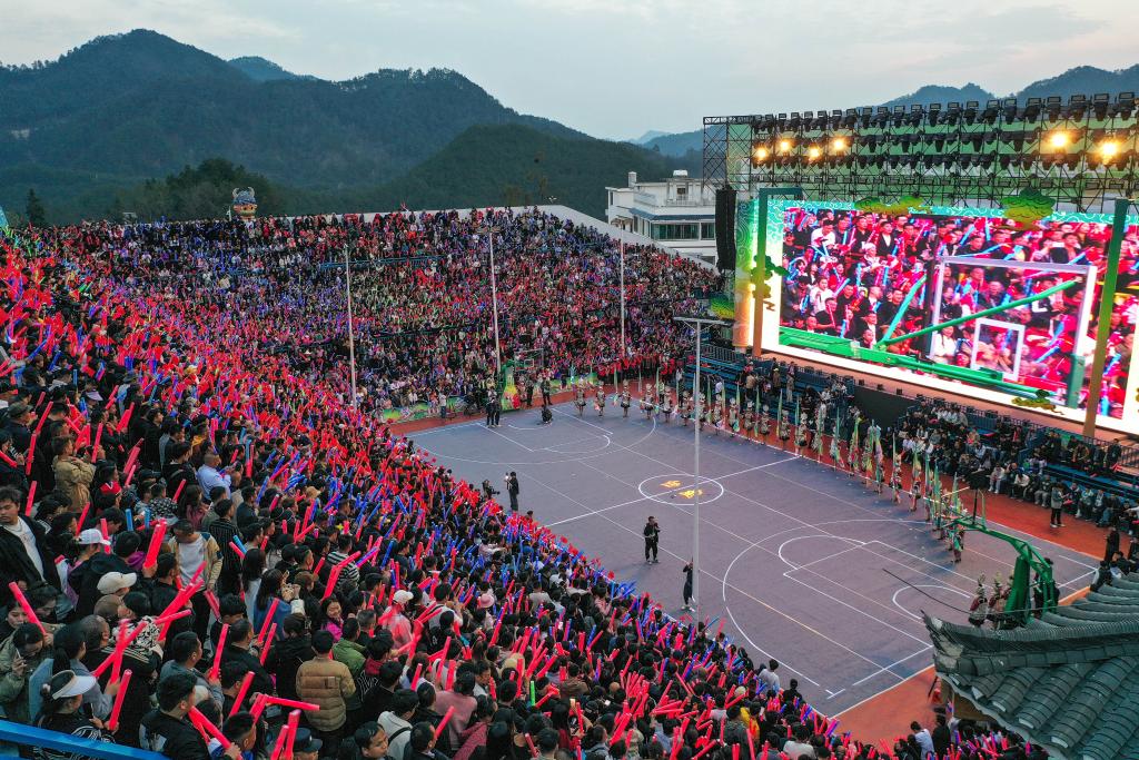 2023年3月25日,村民們在決賽前抵達現場觀看暖場比賽(無人機照片)。當日,貴州省首屆“美麗鄉村”籃球聯賽總決賽在黔東南州臺江縣臺盤村開打。這項由臺盤村“六月六”吃新節籃球賽發展而來的賽事因為火熱的現場氛圍和“接地氣”的辦賽風格,在2022年“火爆全網”,被網友親切地稱為“村BA”。新華社記者 劉續 攝