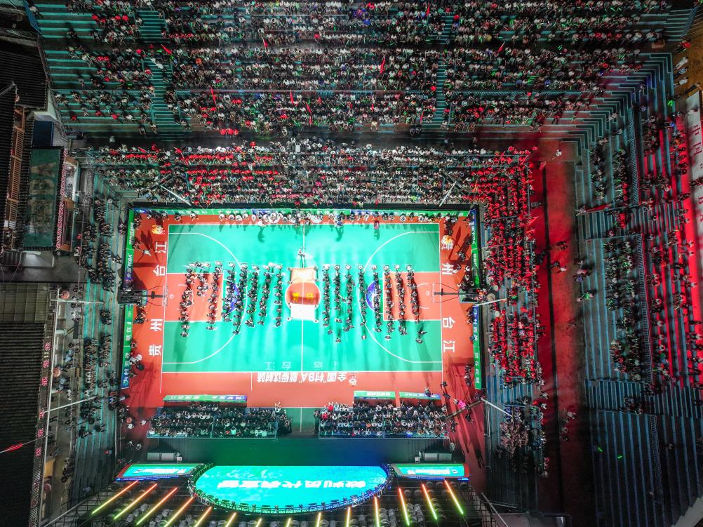 這是2024年3月22日拍攝的2024年鄉村籃球球王爭霸賽開幕式現場(無人機照片)。當日,以“活力四射 迎‘籃’而上”為主題的2024年鄉村籃球球王爭霸賽開幕式在貴州省黔東南苗族侗族自治州臺江縣臺盤村舉行。本次比賽將從3月持續到11月,是一次跨度長、范圍廣的全新賽事。新華社記者 楊文斌 攝