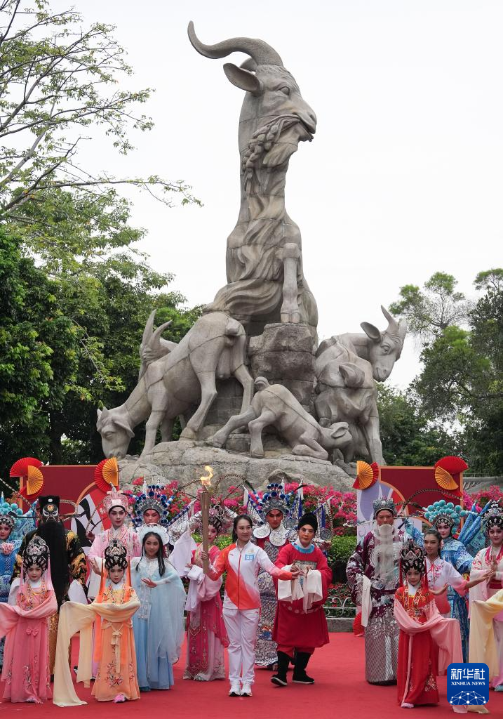 11月2日,火炬手李嘉宜(中)在廣州越秀公園內的五羊雕像前傳遞火炬。
