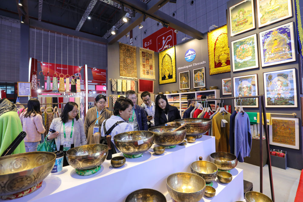 2023年11月7日,在第六屆進博會消費品展區,參觀者在挑選來自尼泊爾的商品。新華社記者 辛夢晨 攝