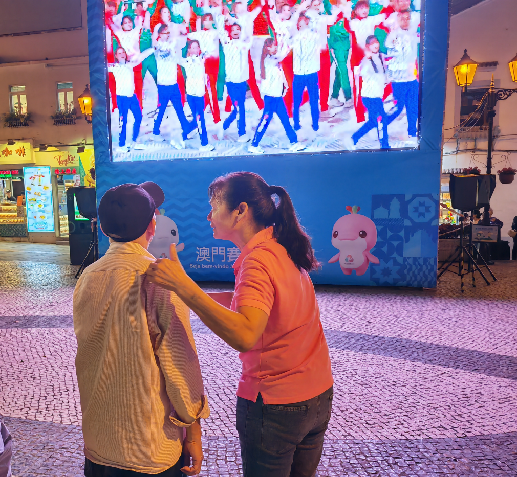 第十五屆全運(yùn)會(huì)開(kāi)幕前幾天,店門口的小廣場(chǎng)上豎起了一塊巨大的電子屏,這是澳門特區(qū)政府為十五運(yùn)會(huì)設(shè)置的公共觀賽點(diǎn)。過(guò)去這個(gè)時(shí)間,官也街還靜悄悄的,如今卻已有早起的游客在屏幕前駐足。