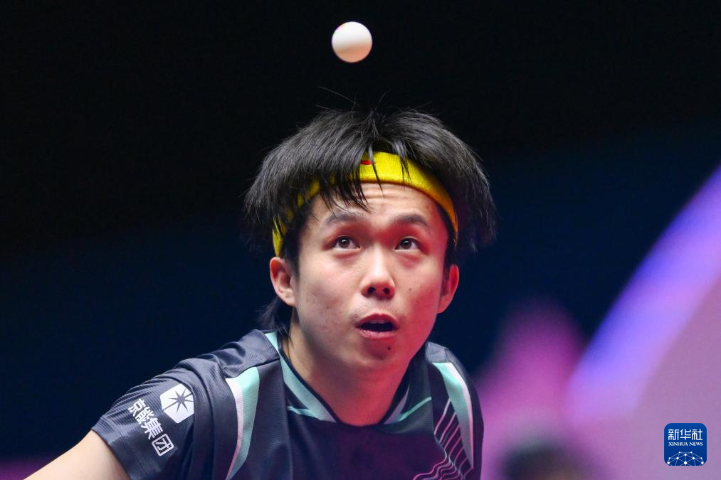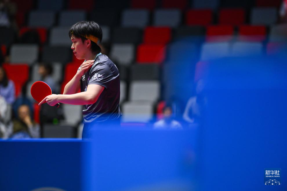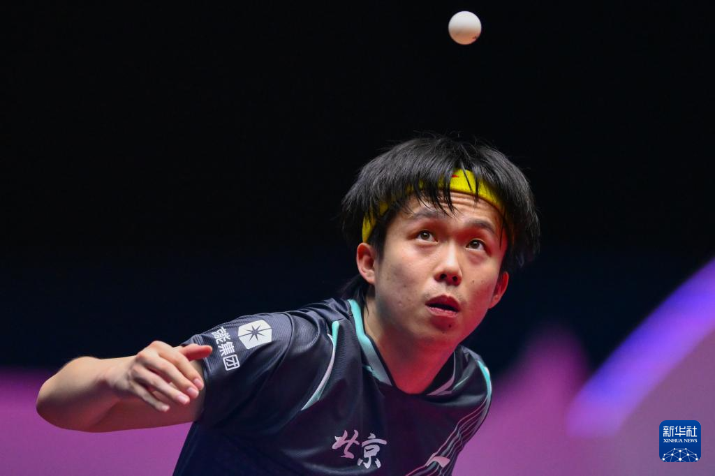 11月10日,王楚欽(上)在比賽中回球。