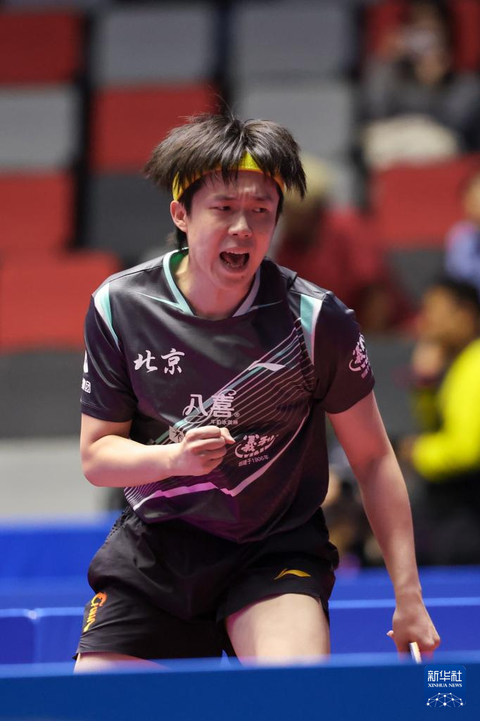 11月10日,王楚欽在比賽中慶祝得分。