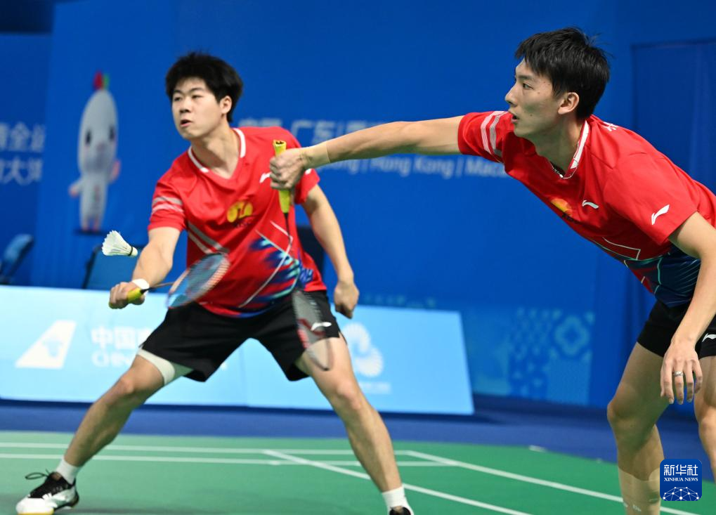 11月11日,廣東隊組合梁偉鏗(左)/任翔宇在男雙比賽中回球。他們2比0戰勝湖南隊組合黃嘉威/夏昊亮。