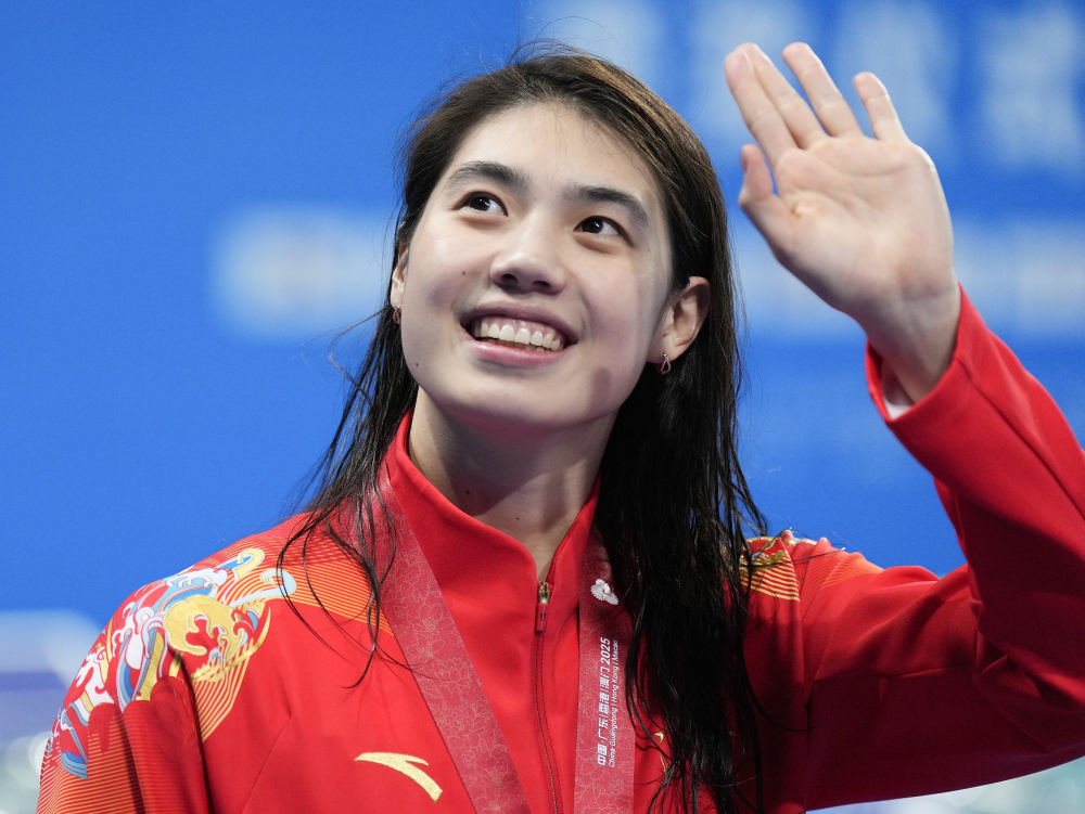 11月11日,冠軍江蘇隊選手張雨霏在頒獎儀式后向觀眾致意。新華社記者 薛宇舸 攝