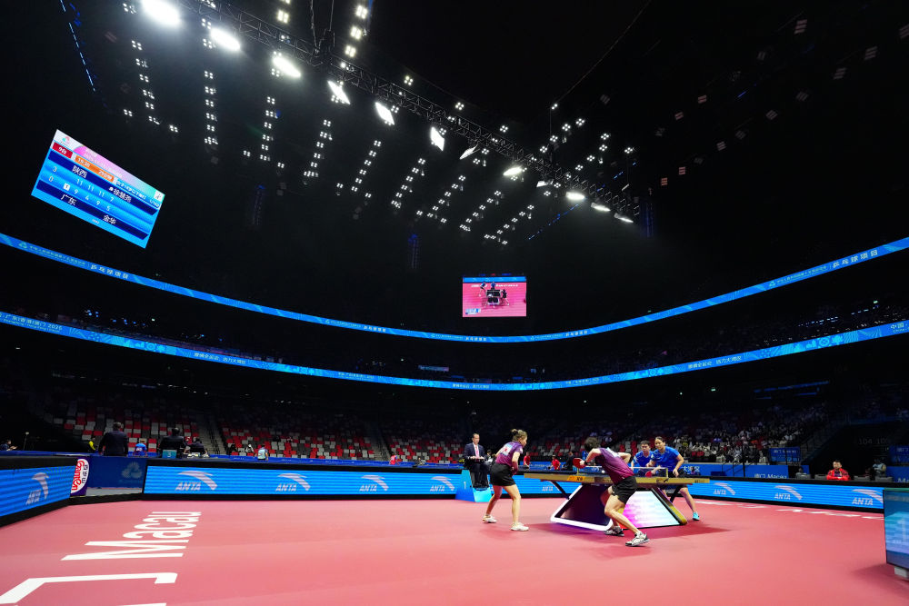 11月11日,林高遠(左三)/劉詩雯在比賽中。當日,在澳門舉行的第十五屆全國運動會乒乓球混合雙打四分之一決賽中,廣東隊組合林高遠/劉詩雯4:1勝上海隊組合孫銘陽/趙釗彥,晉級四強。新華社記者 賴向東 攝