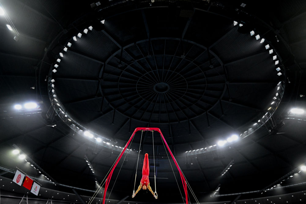 11月10日,湖南隊選手張博恒在吊環比賽中。當日,第十五屆全國運動會體操項目男子預賽第三場在肇慶舉行。新華社記者 杜子璇 攝