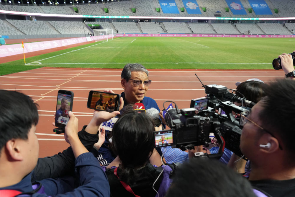 11月12日,徐根寶(中)在賽后接受采訪。新華社記者 丁增尼達 攝