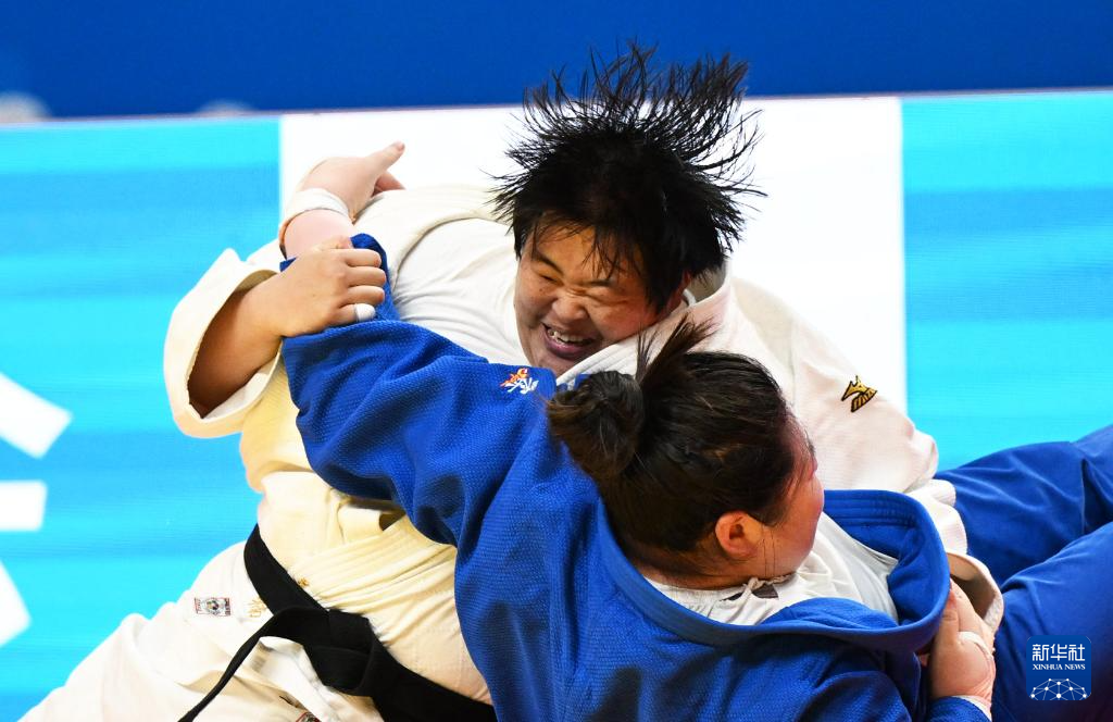 11月13日,山東隊(duì)選手姜雅楠(左)與江蘇隊(duì)選手徐仕妍在女子70公斤以上級(jí)比賽中。姜雅楠戰(zhàn)勝徐仕妍。