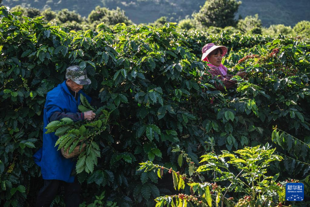 11月16日,咖農在云南省保山市隆陽區新寨村的一處咖啡園內采摘咖啡果。