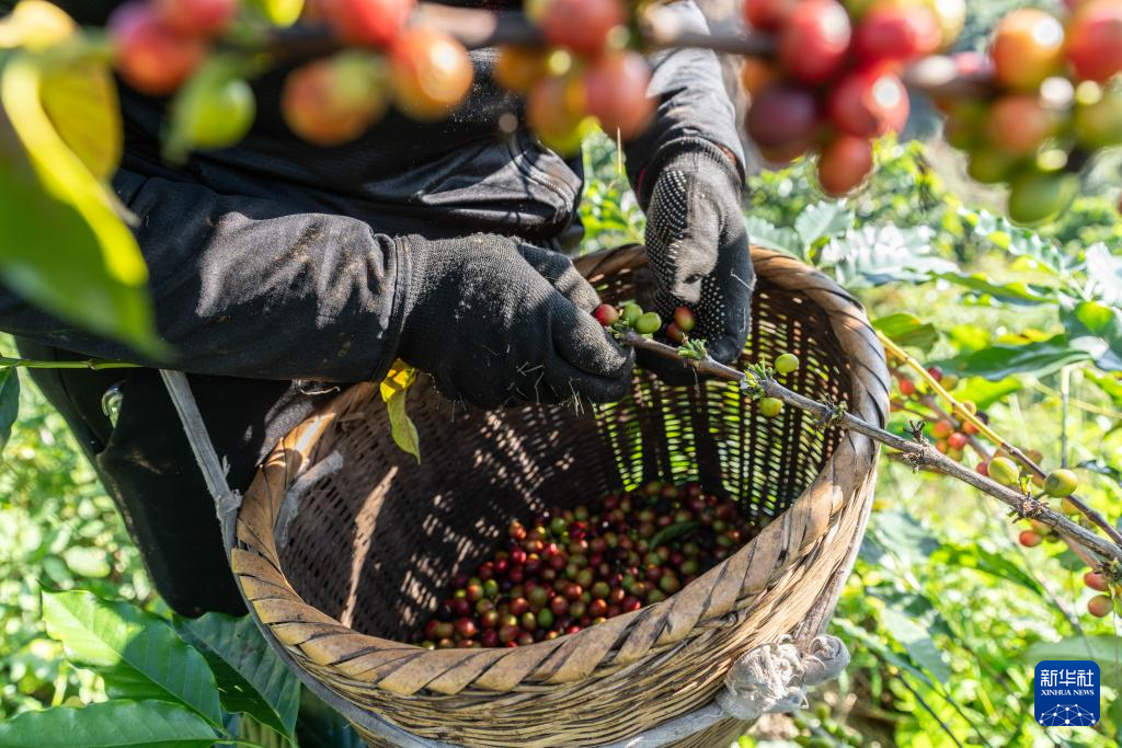 11月16日,咖農在云南省保山市隆陽區新寨村一處咖啡園采摘咖啡果。