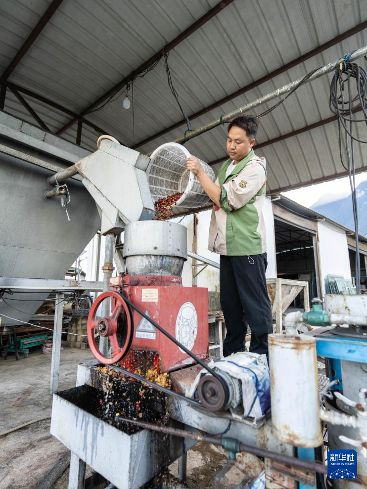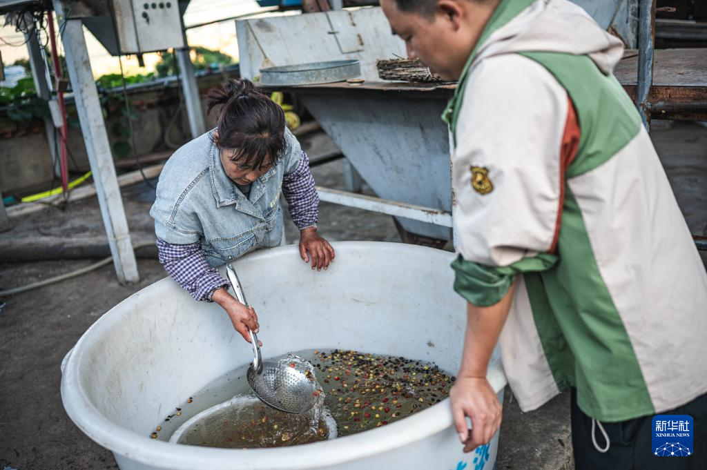 11月16日,咖農在云南省保山市隆陽區新寨村一處咖啡莊園去除咖啡果皮。