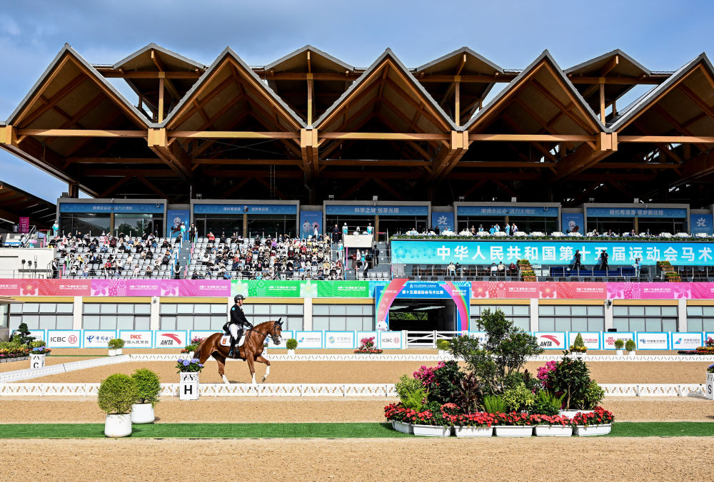 11月13日,西藏隊選手旦增羅旦和馬匹“高飛”在比賽中。當(dāng)日,第十五屆全國運動會馬術(shù)三項賽團(tuán)體賽決賽(個人資格賽)盛裝舞步在廣東深圳光明國際馬術(shù)中心舉行。新華社記者 馮開華 攝