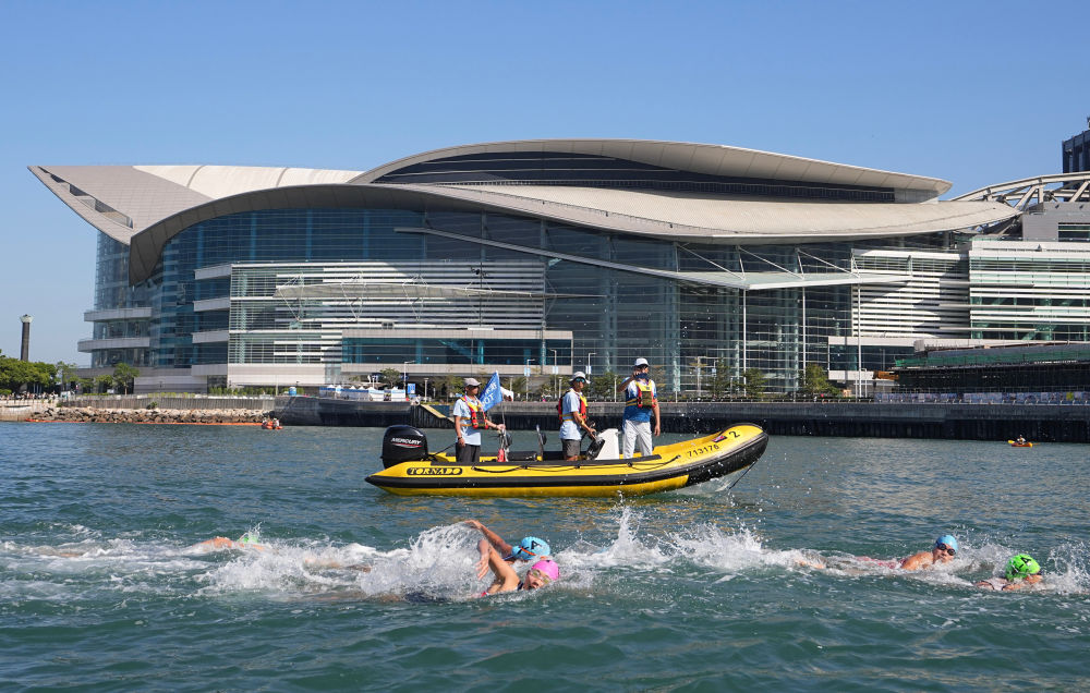 11月16日,參賽選手在游泳比賽中。當(dāng)日,在香港舉行的第十五屆全國運(yùn)動會鐵人三項混合接力決賽中,山東隊獲得冠軍,香港隊獲得亞軍,中國公安體育協(xié)會隊獲得季軍。新華社發(fā)(呂小煒攝)