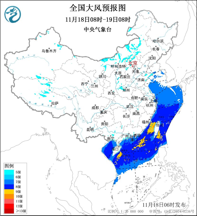 內(nèi)蒙古中部、西藏北部、河北北部、河南西部、江蘇南部、廣西東南部沿海、廣東南部沿海等地部分地區(qū)有5~6級(jí)風(fēng),陣風(fēng)7級(jí);黃海南部海域、東海大部海域、臺(tái)灣海峽、臺(tái)灣以東洋面、巴士海峽、南海北部和中部海域、北部灣將有7~8級(jí)、陣風(fēng)9~10級(jí)的大風(fēng),其中東海南部部分海域、臺(tái)灣海峽、巴士海峽、南海東北部部分海域風(fēng)力可達(dá)9級(jí)、陣風(fēng)10~11級(jí)(見圖3)。中央氣象臺(tái)11月18日06時(shí)繼續(xù)發(fā)布寒潮和大風(fēng)藍(lán)色預(yù)警。