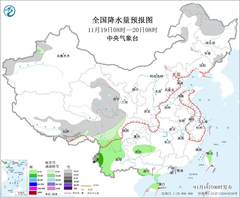 11月18日08時(shí)至19日08時(shí),新疆南疆盆地、西藏北部和東部、青海南部和西部、甘肅河西、川西高原北部等地部分地區(qū)有小雪或雨夾雪。西南地區(qū)東部和南部、華南大部、臺(tái)灣島等地部分地區(qū)有小到中雨,其中,云南西南部、臺(tái)灣島北部等地部分地區(qū)有大雨(25~40毫米)(見圖4)。