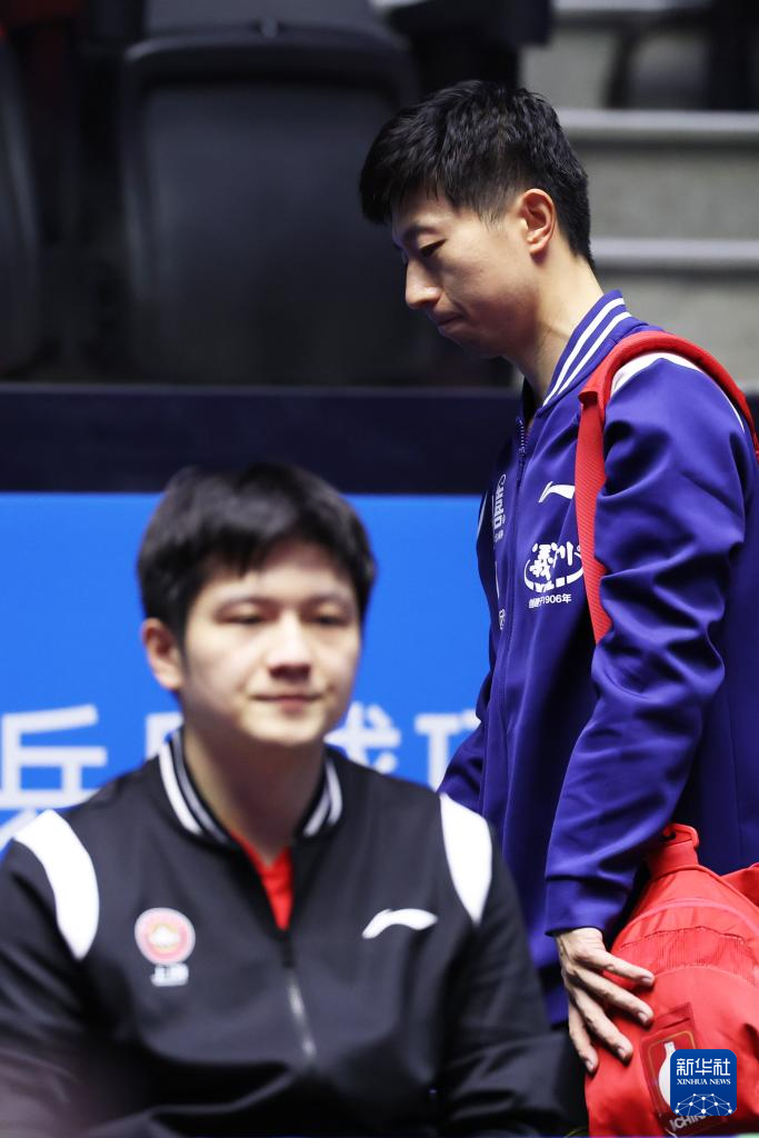 11月18日,北京隊選手馬龍(右)賽后離場。