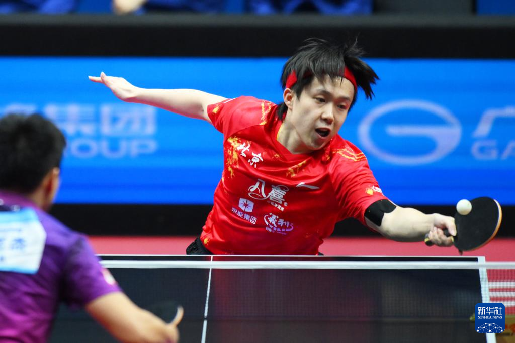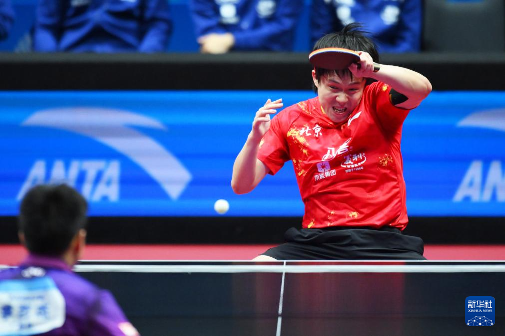 11月18日,北京隊選手黃友政在男單比賽中回球。最終,他3比0戰勝廣東隊選手林高遠。
