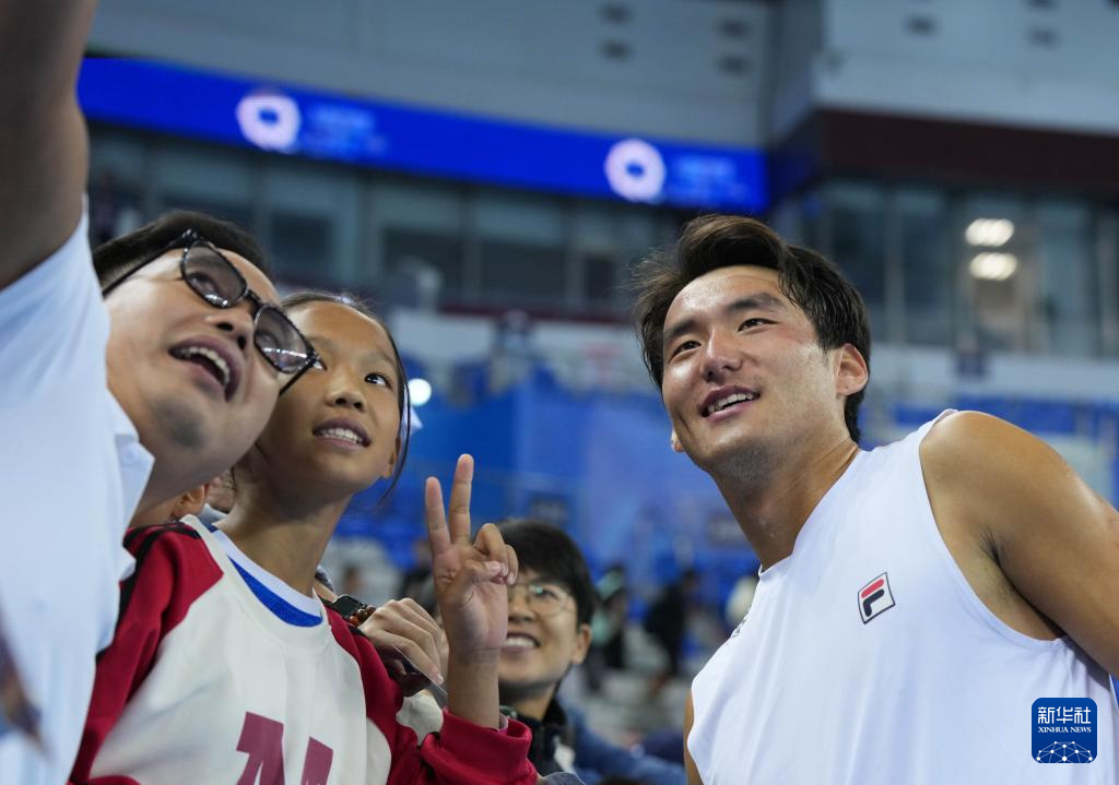 11月18日,浙江隊(duì)選手布云朝克特(右一)在比賽后與觀眾合影。