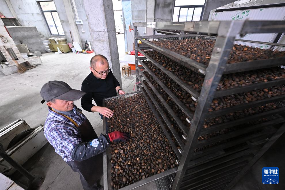 11月18日,在福州市永泰縣同安鎮連山村一公司車間內,工作人員在查看烘干的油茶粒。新華社記者 姜克紅 攝