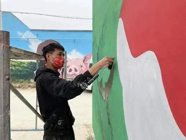 尚勤杰畫了兩面墻后,就有人找上門來,村后面有處景點開辦了一個研學基地,說愿意給尚勤杰提供工資,希望他能把整條街的墻都畫了。